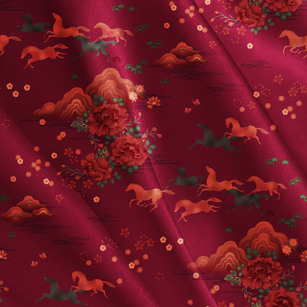 Shop the Collection →Designed by FeiFei Ruan, a modern festive print featuring a vibrant scene with galloping horses, symbolising hope, vitality, and new beginnings.